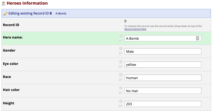 | record_id | name | gender | eye_color | race | hair_color | height | weight | publisher | skin_color | alignment | form_status_complete |